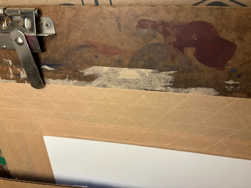 Below is an image of my paint board. You can see the clipboard-like texture of the wood which is ideal for the water-activated gum packing tape also shown below to stick to it.